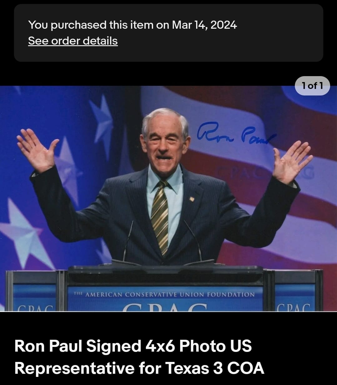 I am also working on holding giveaways for members. I am still thinking about what the rules will be for those. I will first be giving away this signed picture of Ron Paul. Stay tuned for those details!